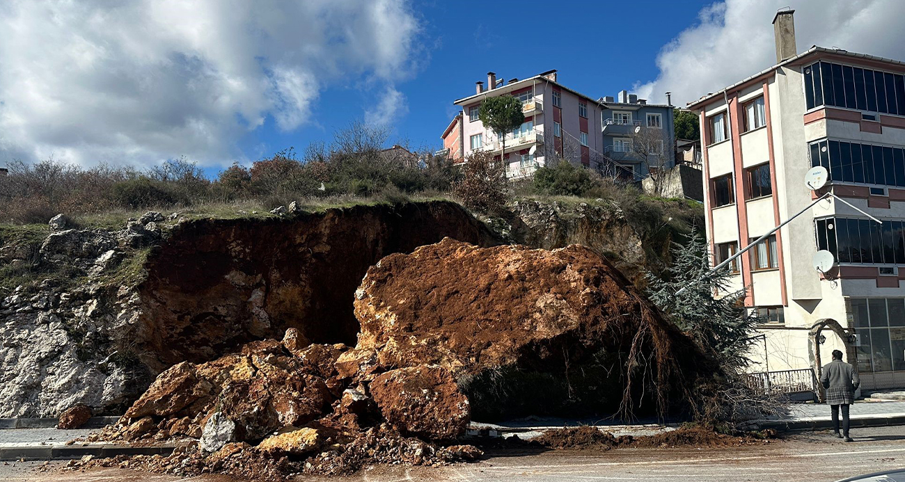 Dursunbey'de dev kaya parçası yola düştü
