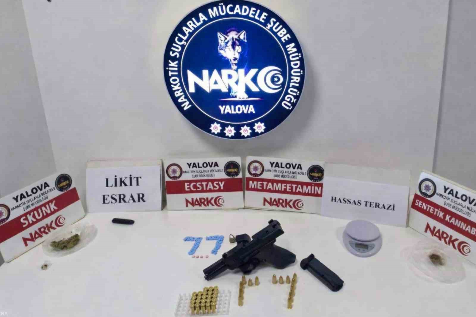Yalova’da polis tarafından düzenlenen operasyonda gözaltına alınan 6 şüpheliden 4’ü tutuklandı. Alınan bilgiye göre, Yalova Emniyeti İstihbarat ve Narkotik Suçlarla Mücadele Şube müdürlüklerince risk-analiz sonucu kent merkezinde gerçekleştirilen operasyonlarda ve İstanbul ilinde yakalattırılan şahıslardan, toplam 242,75 gram çeşitli türlerde uyuşturucu ve uyarıcı madde, 64 adet uyuşturucu hap, hassas terazi, 9 mm çapında tabanca, 1 şarjör ve 39 adet fişek ele geçirildi. Konu ile ilgili 6 şahıs hakkında Yalova Cumhuriyet Başsavcılığınca TCK Madde 188 "Uyuşturucu veya Uyarıcı Madde İmal ve Ticareti" suçundan adli işlem başlatıldı. Adli mercilere sevk edilen şüphelilerden 4’ü tutuklandı. 2 zanlı ise adli kontrol kararıyla serbest bırakıldı.